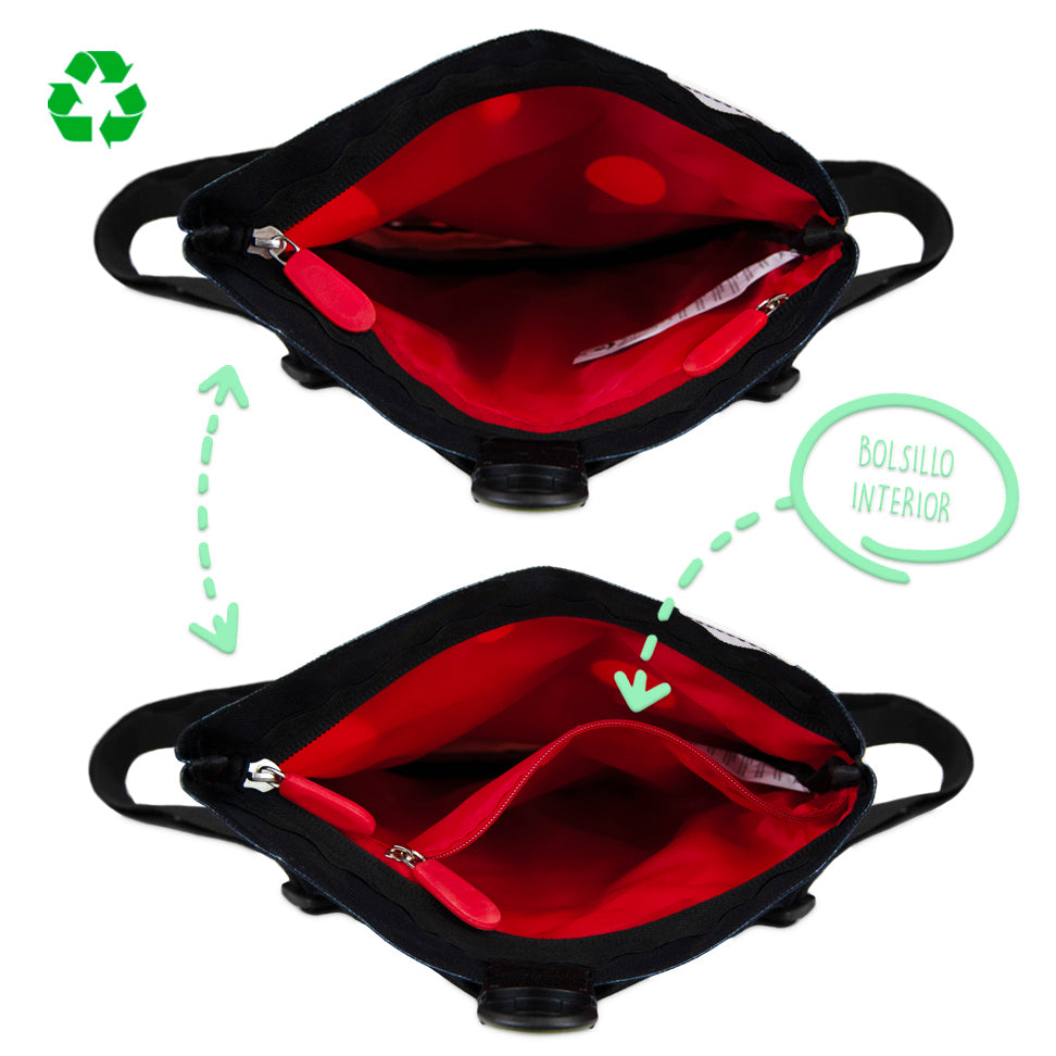 Fabricada en material reciclado, esta mochila demuestra que se puede ser práctica, bonita y responsable al mismo tiempo. Perfecta para regalar, para llevar cada día o para añadir una dosis de arte a tu rutina diaria.