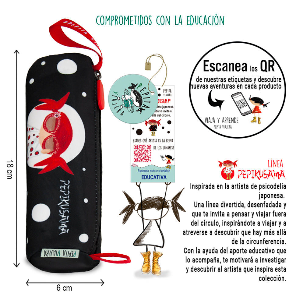 Flexible, ligero y muy útil. Decide qué vas a guardar en tu porta-todo con elástico para llevarlo organizado con tus libretas, monederos o lo que sea que lleves en tu mochila o bolso. Con una imagen irreverente inspirada en la famosa artista japonesa, más conocida como la reina de los lunares. Completa tu línea de Pepikusama con este complemento tan útil y práctico para tus viajes del día a día.